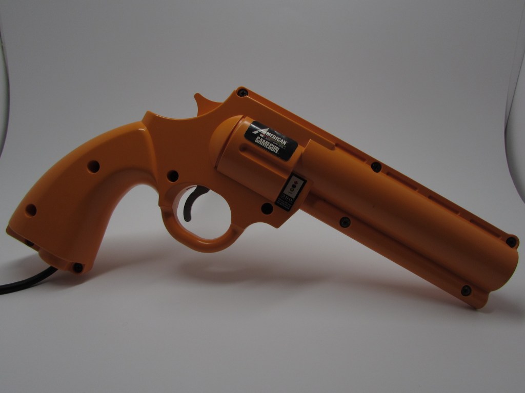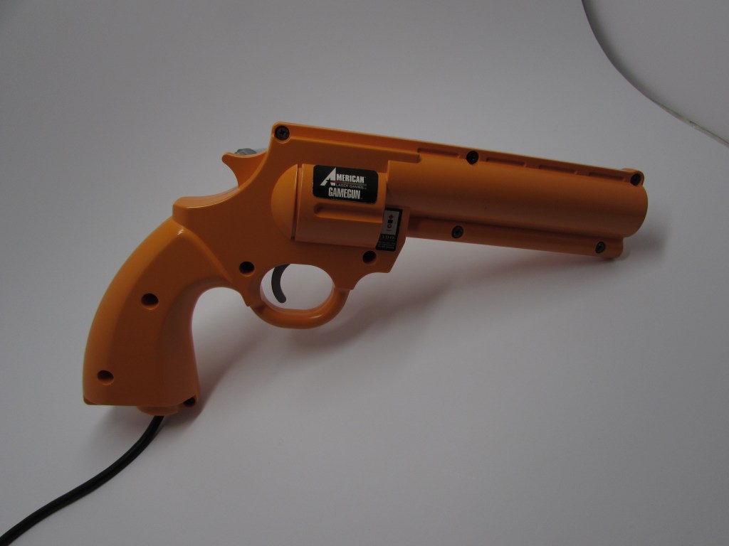 The GAMEGUN was released for American Laser Game titles and has compatibility with Virgin Interactive’s Demolition Man. Two main variants exist of the GAMEGUN. One is a single player gun and the other is a two player gun with a splitter on the end of the cord.